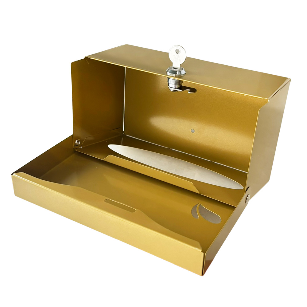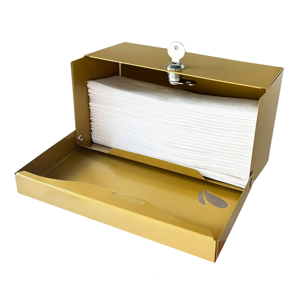 Mini dispenser para papel toalha interfolhado. Possui chave/fechadura metálica anti-furto e visor de nível. Compacto e resistente. Confira todos os itens da linha Dourada.